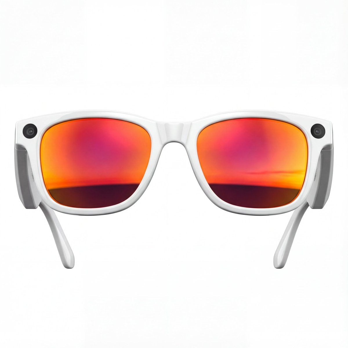 מסגרת לבנה בולטת עם עדשות מראה אדומות.